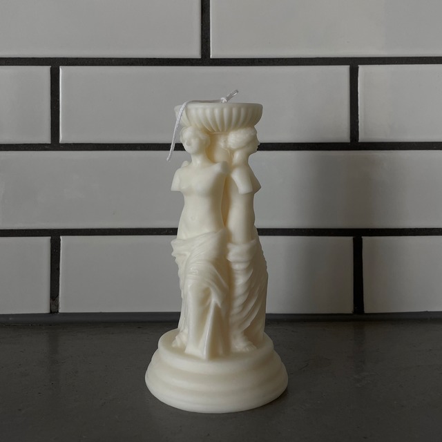 三美神キャンドル 【size】 約15cm×約8cm 【material】 主はソイワックス(天然成分100%) 【color】 着色無し 【fragrance】 無香料 【〜キャンドルで癒しのひとときを〜】 《空気の浄化》 ソイキャンドルは火を灯し燃えることで空気中の不純物を減退させ、空気を浄化させる作用があります。 《マイナスイオン効果》 キャンドルを燃やすと、化学反応が起こり微量の水分が発生します。この時、水と共にマイナスイオンが発生し、一度キャンドルに火を灯して発生するマイナスイオンの量は、森林浴で浴びる量を上回ると言われています。 《1/fゆらぎ》 不規則なキャンドルの炎の揺れは『1/fゆらぎ』と呼び、波の音や心臓の鼓動と同じように、炎を眺めていると気持ちが落ち着き心地良い気分になると言われています。 《安らぎ》 キャンドルの炎の色は副交感神経を刺激する働きがあり、気持ちが張り詰めている時でも、キャンドルの炎をしばらく眺めていると副交感神経の働きが活発になりリラックスした気分になります。 -------------------------------------- ソイキャンドルは低い温度でゆっくり溶ける為燃焼時間が長く、ススや煙が出にくいので食事中やおやすみ前でも安心してお使い頂けます。 インテリアとしてお好みの溶かし具合で飾って頂く事もお勧めです。 当店のキャンドルは身体にも環境にも優しいナチュラルな素材で製作しております。ソイキャンドルは石油系のワックスに比べ有害物質を含まない為アレルギーの心配が少なく、小さなお子様やペットがいる家庭でも安心してお使い頂けます。 ※大豆アレルギーをお持ちの方はかかりつけの病院にて必ずご相談ください。 ※ご購入前に必ずショッピングガイドをご一読ください。 https://escandle.base.shop/p/00001 《ご使用上の注意》 火の取り扱いには十分に注意して下さい。 火を灯す際はある程度深さのある耐熱性の受け皿やプレートなどをお使い下さい。 詳しい注意事項はショッピングガイドにて記載しておりますのでそちらをご確認ください。 (購入時に商品と一緒に取扱説明書を同封しております。) 《送料・配送方法》 『ヤマト宅急便』で発送致します。 10,000円以上の購入で送料が無料になります。