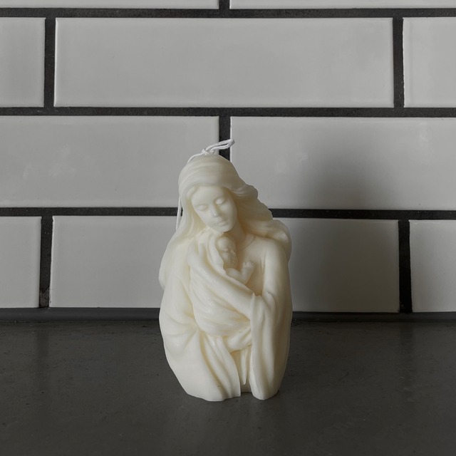 聖母マリア 【size】 18cm×7.5cm×6cm 【material】 主はソイワックス(天然成分100%) 【color】 着色無し 【fragrance】 無香料 【〜キャンドルで癒しのひとときを〜】 《空気の浄化》 ソイキャンドルは火を灯し燃えることで空気中の不純物を減退させ、空気を浄化させる作用があります。 《マイナスイオン効果》 キャンドルを燃やすと、化学反応が起こり微量の水分が発生します。この時、水と共にマイナスイオンが発生し、一度キャンドルに火を灯して発生するマイナスイオンの量は、森林浴で浴びる量を上回ると言われています。 《1/fゆらぎ》 不規則なキャンドルの炎の揺れは『1/fゆらぎ』と呼び、波の音や心臓の鼓動と同じように、炎を眺めていると気持ちが落ち着き心地良い気分になると言われています。 《安らぎ》 キャンドルの炎の色は副交感神経を刺激する働きがあり、気持ちが張り詰めている時でも、キャンドルの炎をしばらく眺めていると副交感神経の働きが活発になりリラックスした気分になります。 -------------------------------------- ソイキャンドルは低い温度でゆっくり溶ける為燃焼時間が長く、ススや煙が出にくいので食事中やおやすみ前でも安心してお使い頂けます。 インテリアとしてお好みの溶かし具合で飾って頂く事もお勧めです。 当店のキャンドルは身体にも環境にも優しいナチュラルな素材で製作しております。ソイキャンドルは石油系のワックスに比べ有害物質を含まない為アレルギーの心配が少なく、小さなお子様やペットがいる家庭でも安心してお使い頂けます。 ※大豆アレルギーをお持ちの方はかかりつけの病院にて必ずご相談ください。 ※ご購入前に必ずショッピングガイドをご一読ください。 https://escandle.base.shop/p/00001 《ご使用上の注意》 火の取り扱いには十分に注意して下さい。 火を灯す際はある程度深さのある耐熱性の受け皿やプレートなどをお使い下さい。 詳しい注意事項はショッピングガイドにて記載しておりますのでそちらをご確認ください。 (購入時に商品と一緒に取扱説明書を同封しております。) 《送料・配送方法》 『ヤマト宅急便』で発送致します。 10,000円以上の購入で送料が無料になります。
